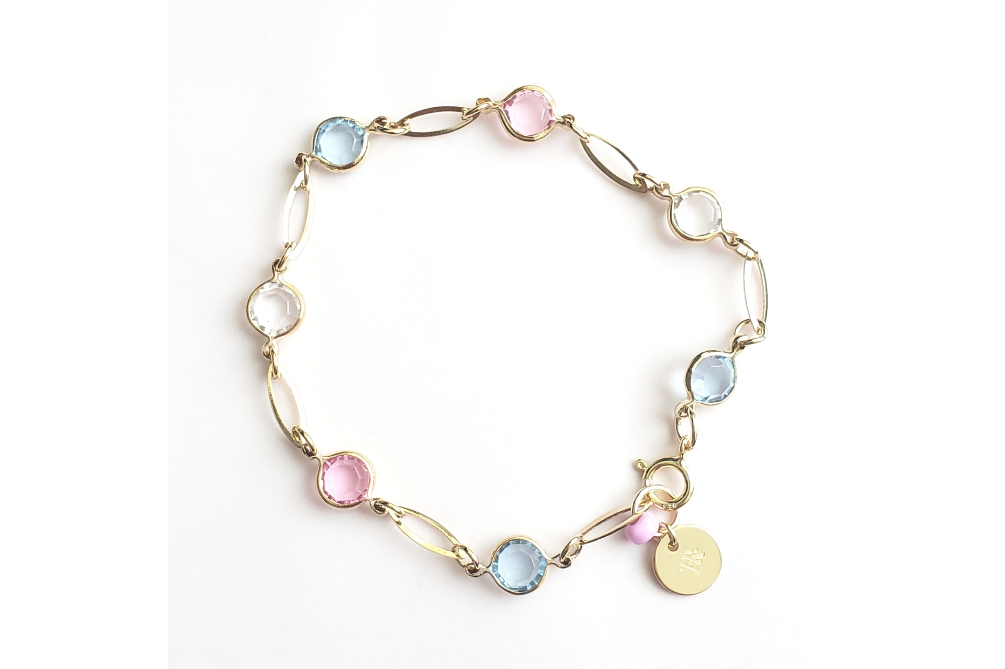 Cutie gem Bracelet 18k gold platedは、ピンクとベビーブルー、そしてクリアの3色のガラスパーツのミックス。
