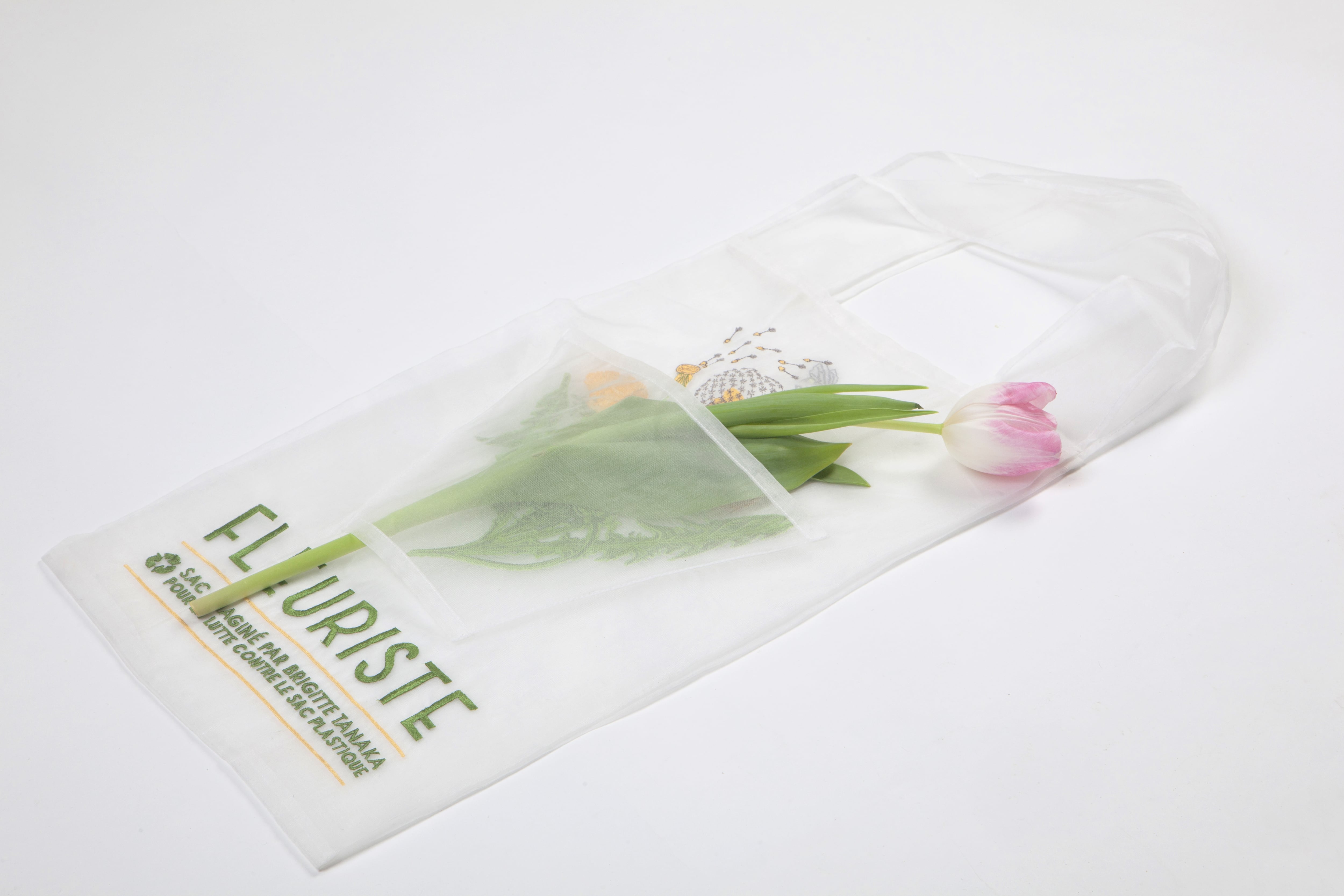 環境社会にも配慮した商品を制作しており、オーガンジーバッグは、現代の消費社会の中で問題視されているプラスチックバッグと同じ形でありながら、何度でも使える素材を使用し、モチーフを刺繍してプラスチックバッグを表現しているアイテムである。